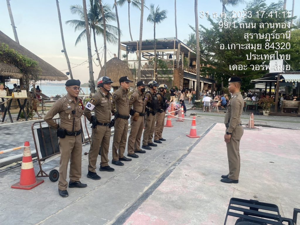 ข้าราชการตำรวจ สภ.บ่อผุด, ตำรวจท่องเที่ยว , ตำรวจตรวคนเข้าเมือง , กอ.รมน. , ปกครองอำเภอเกาะสมุย และหน่วยงานต่างๆที่เกี่ยวข้อง ร่วมกันปล่อยแถว ดูแลความปลอดภัยให้กับนักท่องเที่ยวในช่วงเทศกาลปีใหม่ 2567