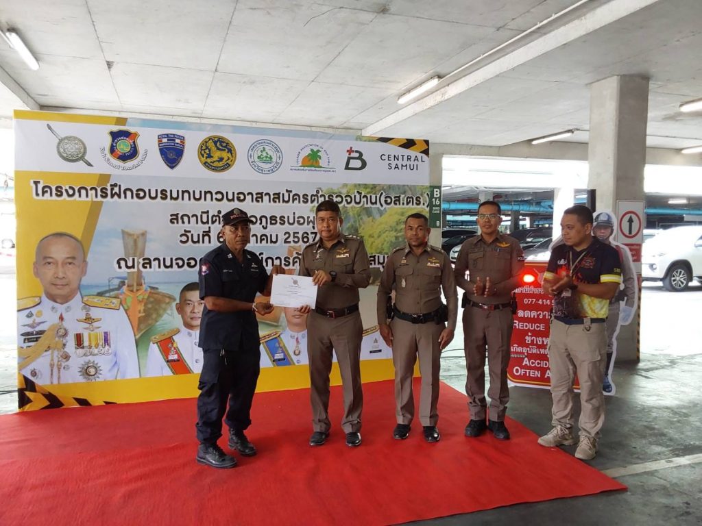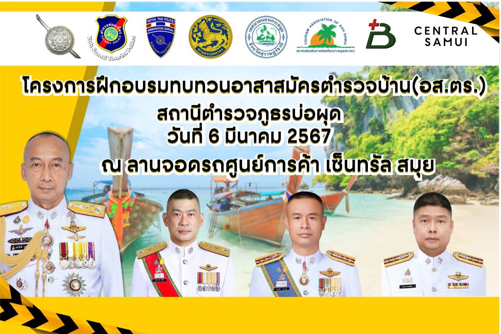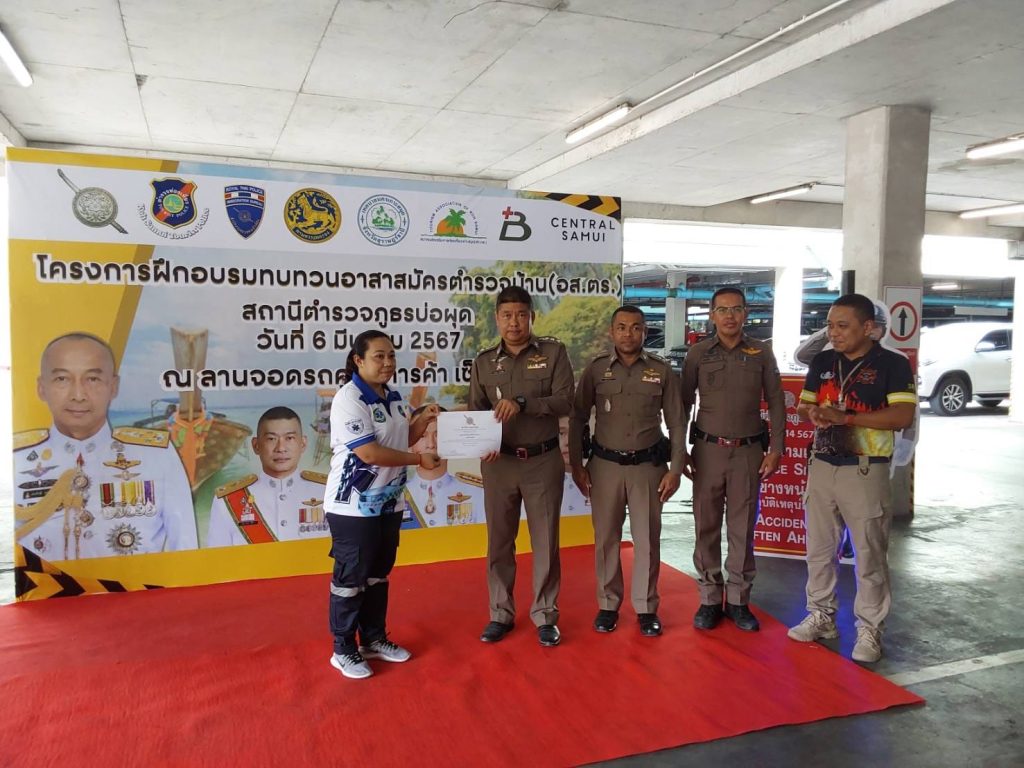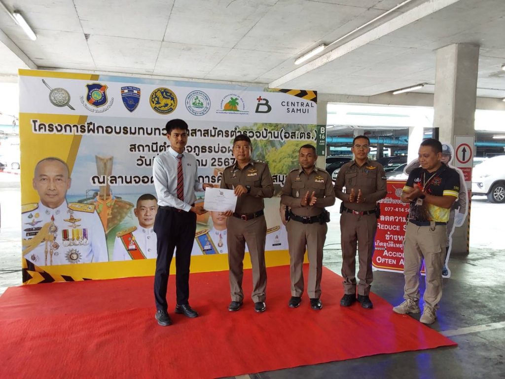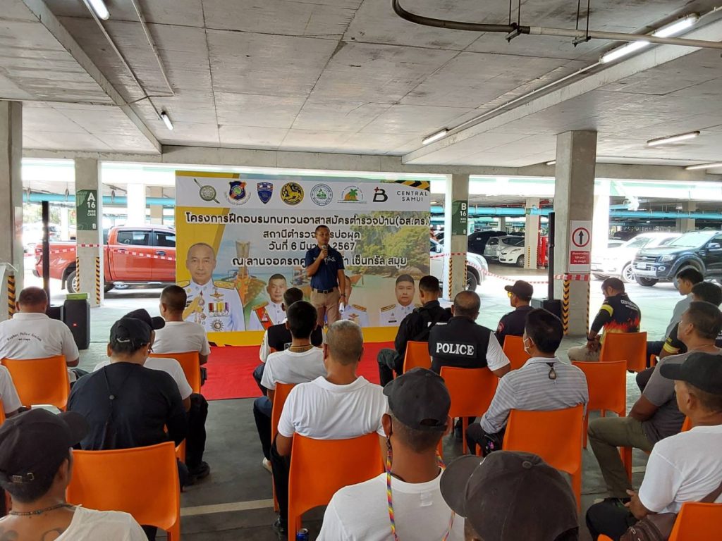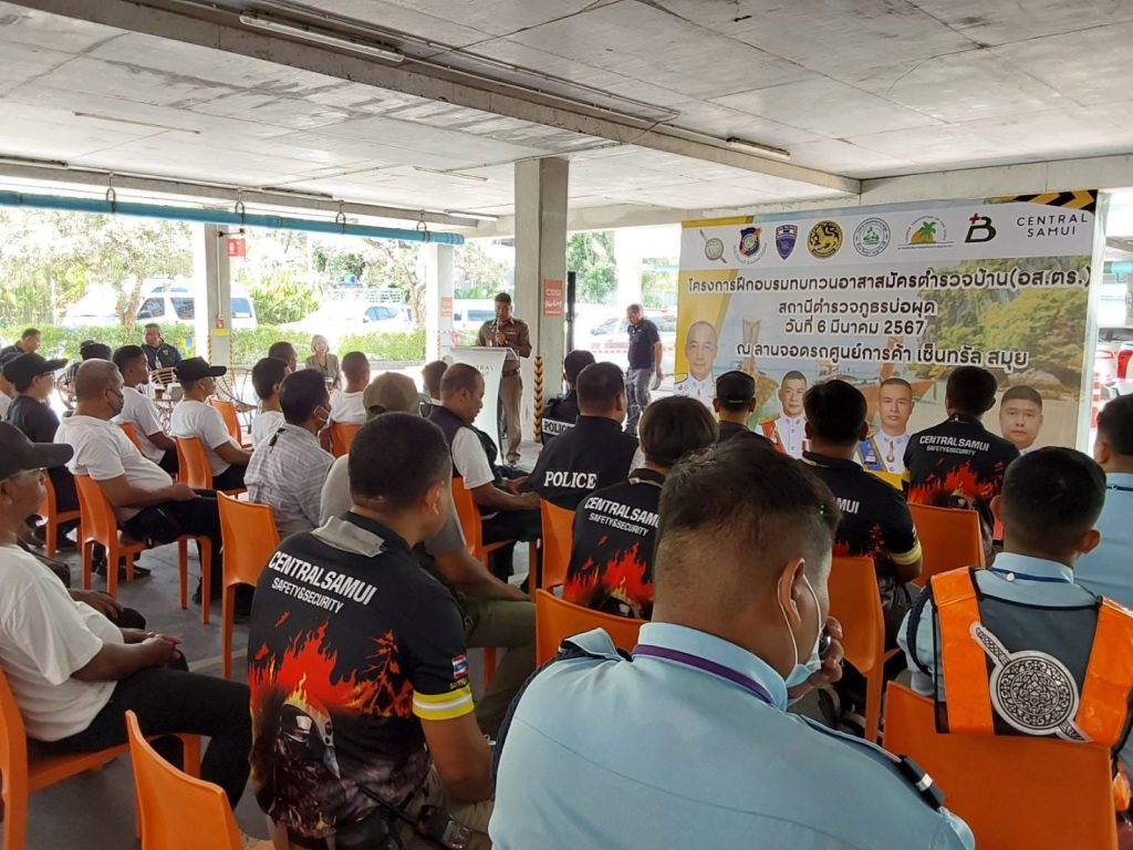 และคณะวิทยากร จาก สภ.บ่อผุด พร้อมด้วย ตำรวจท่องเที่ยว, ตรวจคนเข้าเมือง พท.เกาะสมุย, ฝ่ายปกครองอำเภอเกาะสมุย, สมาคมส่งเสริมการท่องเที่ยวเกาะสมุย, ตัวแทนผู้บริหารห้างเซ็นทรัลเฟสติวัลสมุย, รพ.บ้านดอนอินเตอร์เนชั่นแนลสมุย, สมาคมกู้ชีพกู้ภัยเกาะสมุย และหน่วยงานต่างๆในพื้นที่ ร่วมพิธีเปิดโครงการฝึกอบรมทบทวนอาสามัครตำรวจบ้าน(อส.ตร.) สภ.บ่อผุด ณ ลานจอดรถห้างเซ็นทรัลเฟสติวัลสมุย มีอาสาสมัครตำรวจ อาสาสมัครจราจร จนท.รักษาความปลอดภัยฯ ร่วมอบรมประมาณ 70 คน