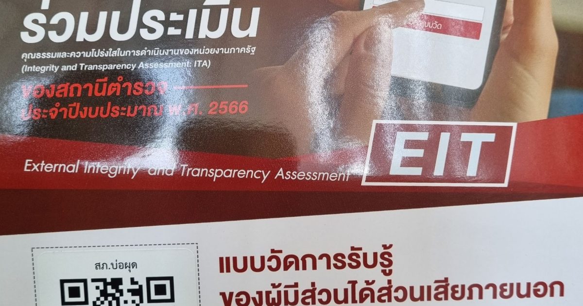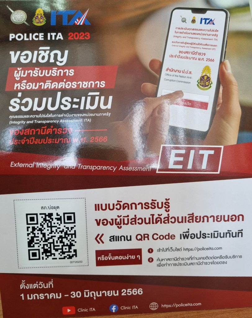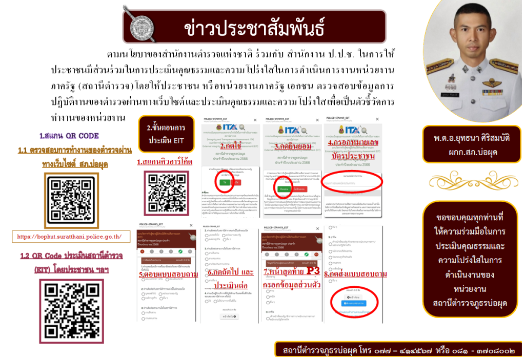 สถานีตำรวจภูธรบ่อผุด จังหวัดสุราษฎร์ธานี ขอเชิญชวนผู้มารับบิรการ / ติดต่อราชการสถานีตำรวจภูธรบ่อผุด ร่วมจัดทำแบบวัดการรู้ของผู้มีส่วนได้เสียภายนอก (External Integrity and Transparency Assessment : EIT) 2023 สำรหับนำไปพัฒนาปรับปรุงการให้บริการของสถานีตำรวจภูธรบ่อผุด